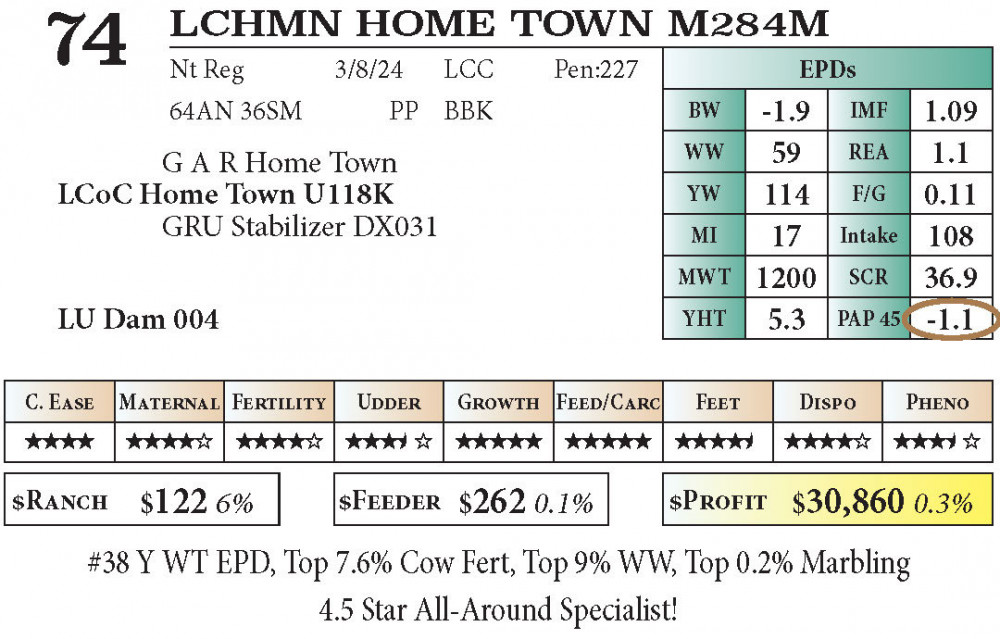 #38 Y WT EPD, Top 7.6% Cow Fert, Top 9% WW, Top 0.2% Marbling