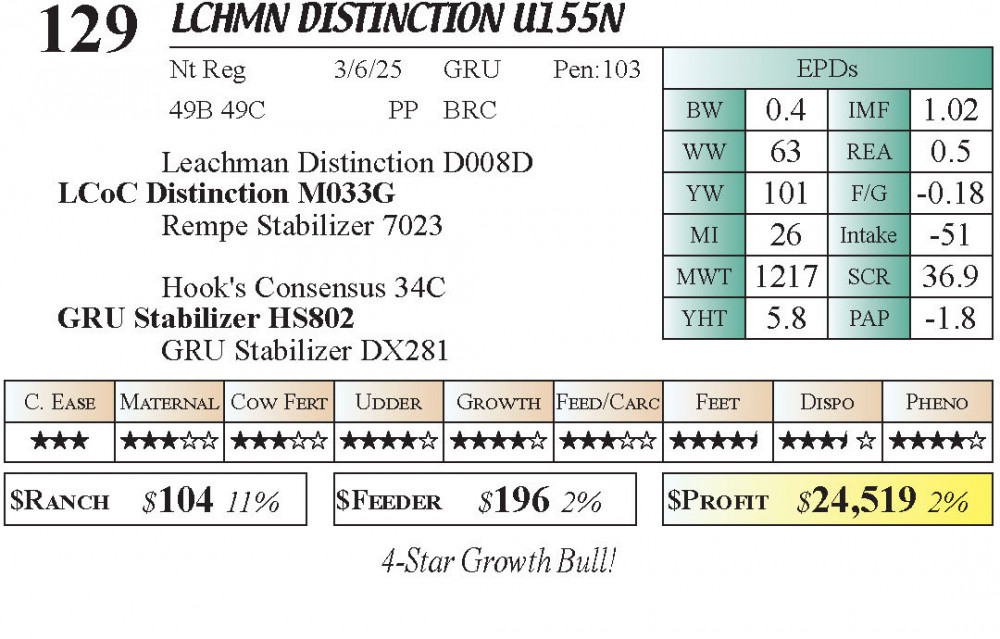 LCHMN Distinction U155N (#129) Grass Time Private Treaty Online Bull Sale